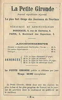 La Petite Gironde was a French daily newspaper from the south and southwest regions of France. It was founded in 1872 and lasted until 1944. With a “moderate republican” tendency, it wanted to be a large regional republican newspaper and a widely consumed cultural product. Originally a moderate centrist, its editorial line straightened out over the years, until it became close to that of L'Action française in the turmoil of the First World War. The newspaper was a collaborationist during the Occupation, which led to its ban late in World War II.[1]