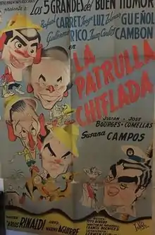 La Patrulla chiflada is a 1952 Argentine adventure comedy film set in Africa,[1] directed by Carlos Rinaldi and featuring the Los Cinco Grandes del Buen Humor (Five Greats of Good Humor) group of comic actors.[2] It stars Rafael Carret, Jorge Luz, Zelmar Gueñol, Guillermo Rico and Juan Carlos Cambón.[3]