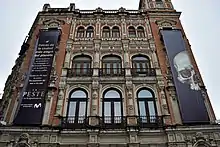 Telefónica headquarters in Seville, with an advertisement of La peste before its release.