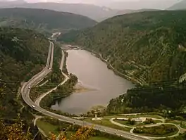 Running on each side of the lake are two important transport arteries. On the south side the Haut-Bugey railway line, initially a regional line from Bourg en Bresse to Bellegarde, but rebuilt in 2010 to carry TGVs from Geneva to Paris