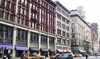 Before becoming a shopping district, this area was residential and included rows of identical brownstone townhouses.[6] These townhouses were replaced in the 1860s by department stores. The architectural style of this district shifted to Beaux-Arts, Neo-Renaissance, Romanesque Revival, and Queen Anne.[7] Many of the new buildings used cast iron because it was cheap and could be made into any shape for extravagant decorations.[6] The first to make this move was Arnold Constable in 1868, though other were quick to follow.[7] The area first came to prominence in 1860, when the Prince of Wales stayed at the Fifth Avenue Hotel, located on the corner of Fifth Avenue and 23rd Street, signalling to New York's high society that the neighborhood was acceptable to royalty.[2] Between the Civil War and World War I, the district was the location of some of New York's most famous department stores and upscale retailers, including B. Altman, Best & Co., Arnold Constable, Bergdorf Goodman, Gorham Silver, Thurn, W. & J. Sloane, Lord & Taylor, and Tiffany & Co.[8][2] The Ladies' Mile also boasted upscale restaurants, booksellers and publishers, and offices and showrooms for piano manufacturers, such as in the Sohmer Piano Building. Performance venues in the district included the Academy of Music and Steinway Hall; the first location of the Metropolitan Museum of Art was there as well.[2]