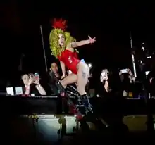 The stage was created to embody the New York City fire escapes making it multi-leveled and comparable to the self-titled album cover by rock band Grateful Dead.[13][14] It had a large red curtain to hide it from the audience and was similarly decked with roses. A rose-draped ladder was placed at the left side of the stage which helped Gaga climb the mezzanine floors.[15] A catwalk was constructed behind the stage, which was lined with more roses, and her dancers performed on them. A piano was placed in front of a window representing Gaga's old apartment in New York City. The Lower East Side of New York was represented by the replica of a F train carriage on the auxiliary platform of Roseland named as the "Artpop Zone", decked with neon lights and spelling out "176 Stanton Street", Gaga's old address.[16] A confetti cannon was also kept for the performance of "Applause" and the giant disco ball of the venue was used.[17]