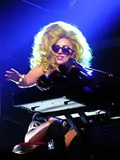 Thematically, both the stage set up and the wardrobe consisted of many roses and was an homage to the venue and the name "Roseland".[9] Starting from arriving to the concert hall in a nude bodysuit and mask, embellished with red roses, the outfits worn on the stage included Gaga's characteristic attire from her previous live performances. One dress consisted of purple-colored hot pants, fishnets, and a mask, all covered with purple roses, along with a metallic purple jacket.[10] Photographer Terry Richardson took photos of the backstage activities which revealed that a second purple jacket was also worn by Gaga and it was bejeweled and emblazoned with the word "Gaga" on the rear side.[11] The instruments used by the singer, such as a keyboard, was also decked similarly with red roses. Another dress included shoulder spikes reminiscent of the singer's attire during her first studio album era, coupled with a hat made of black roses. A green colored wig was also worn by Gaga which she had introduced during the Artpop era.[10] Gaga's vocal coach Don Lawrence, who began working with her when she was 13, assisted her before each show, either by being present there or through phone. Gaga practiced her vocal warm-ups one hour prior to the start of each show.[12]