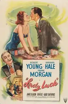 Lady Luck is a 1946 American comedy film directed by Edwin L. Marin and starring Robert Young, Barbara Hale and Frank Morgan.[3] [4] It was produced and distributed by RKO Pictures. The picture tells the story of a professional gambler who falls in love with a woman who hates gambling and tries to reform him.