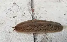 Laevicaulis stuhlmanni shows a flattened body and a dark to light brown colour. Adults are on average 45 mm long and 15.5 mm wide. The weight of an adult averages around 3.5 g.[1]