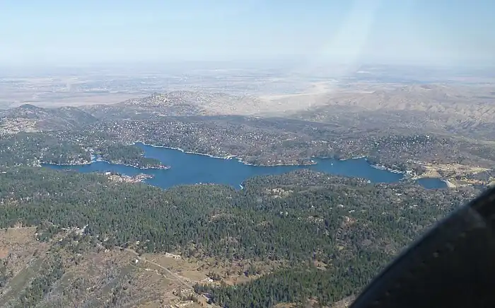 Lake Arrowhead is an artificial lake located in the San Bernardino Mountains on Little Bear Creek, a tributary of Deep Creek and the Mojave River. It has a surface area of approximately 780 acres (320 ha) and a capacity of 48,000 acre⋅ft (59,000 dam3).[1] It is surrounded by the unincorporated community of Lake Arrowhead in San Bernardino County, California.