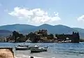 At the innermost north-east tip of the lake is the village of Kapıkırı, as well as the ruins of Heraclea by Latmus (sometimes called Heraclea in Ionia), to distinguish from other ancient Greek sites named Heraclea. The mountain chain of Beşparmak (Dağları) -also named (Latmus) in antiquity- rises on the back, sheltering the non-restored ruins of a dozen monasteries dating from the Byzantine era on its slopes. Yet another monastery is situated on an islet on the lake just across the village. The village of Kapıkırı has recently developed important facitilies catering to visiting tourists, although agriculture and fishing still occupies an important part in its economy.
