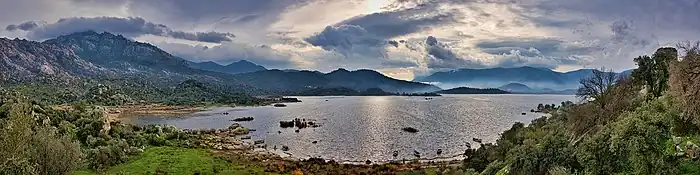Lake Bafa (Turkish: Bafa Gölü) also known as Lake Çamiçi (Turkish: Çamiçi Gölü) and in earlier times the Vafi Sea (Turkish: Vafi Denizi) is a lake situated in southwestern Turkey, part of it within the boundaries of Milas district of Muğla Province and the northern part within Aydın Province's Söke district.[1] The lake used to be a gulf of the Aegean Sea until the Classical period, when the sea passage was gradually closed by the alluvial mass brought by Büyük Menderes River (historically the Maeander or Meander River). The gulf, and later the lake, was named Latmus in antiquity.