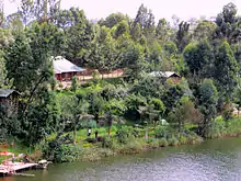 The lake was formed about 18,000 years ago by a volcanic eruption blocking a valley in the Ruchiga mountains near the present day village of Muko on the north-west tip of the lake.[12] The lake's current outlet is a small stream also by Muko which flows into the Ruvuma swamp (this in turn flows into the Ruhezaminda river that ends at Lake Mutanda). The lake is about 22 km long and 6 km at its widest and at a height of about 1973 m.[2] It is surrounded by mountains that reach heights of 600 m above the lake.[12][13]