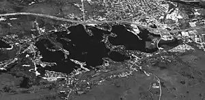 The lake is commonly divided into three smaller bodies of water: North Pond, Middle Pond, and South Pond. They are connected by narrow channels.[18]