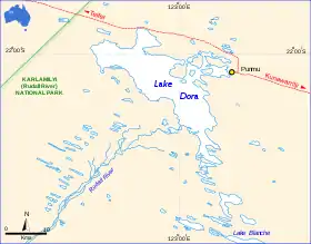 Lake Dora (Wanman: Ngayartakujarra)[3] is a seasonal salt lake located in the Pilbara region of Western Australia. It lies between the vegetated sand fields of the Great Sandy and Gibson Deserts. The Rudall River occasionally flows into Lake Dora.[4]