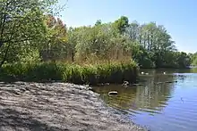 Lake Helmuth Schack is located in the Born Park and was created artificially as a retention basin for the regulation of water levels. Before the establishment of the retention basin there was the Deesmoor, a remnant of the glacial moor valley on the northwest edge of the Osdorf fields.[1] A weir was constructed, and the area was flooded.[2] Over the years, the Born Park was developed around the Schacksee, which is today used as a recreational area, mostly by the inhabitants of Osdorf, Osdorfer Born and nearby Schenefeld in Schleswig-Holstein.