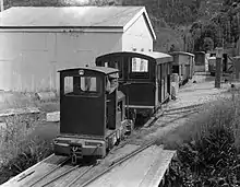 In 1959, the Mount Lyell Mining and Railway Company purchased two 2-foot gauge diesel shunting locomotives, manufactured by Tulloch Limited of Rhodes, New South Wales. These were intended for surface working on their system of that gauge. They were powered with a Fordson 4-cylinder 40 hp. engine. The locomotive weighed 4.5 tons.[3] As shown in the accompanying photograph, one of these locomotives was put to use on the Lake Margaret Tram.