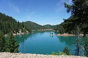 Lake McCloud is a reservoir on the McCloud River in Northern California.[3] The lake forms behind an earthen dam finished in 1965 by the Pacific Gas and Electric Company to control water flows and for generating hydro-electric power.[1] McCloud Dam (National ID # CA00416) is 235 feet (72 m) high, 630 feet (190 m) long at its crest, and impounds a maximum capacity of 35,200 acre-feet (43,400,000 m3).[4]
