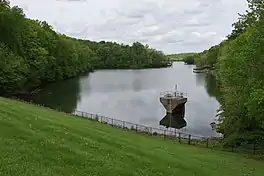 Lake Needwood is a Rock Creek impoundment formed by an earthen embankment, the Lake Needwood Dam. It is made of a 65-foot (20 m) high earthen dam built on a fractured rock foundation formed at the junction of the Boulder Gneiss and Upper Pelitic Schist geological formations.[4][5] In addition to the Lake Needwood's principal spillway outlet, it has a 185-foot (56 m) wide emergency spillway originating between the Westside and the Rock Creek Trails. The dam was designed by the Natural Resources Conservation Service.[5]