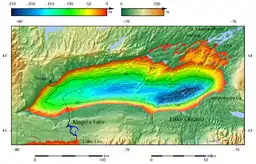 - ↑ National Geophysical Data Center Archived March 23, 2015, at Wikiwix, 1999. Bathymetry of Lake Ontario. National Geophysical Data Center, NOAA. doi:10.7289/V56H4FBH [access date: March 23, 2015].