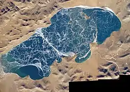 Puma Yumco in winter. The north-south white line is a possible ice ridge, formed by east-west winds subsequently highlighted by snow.