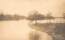 The lake's long and narrow shape posed a challenge to settlers of the Worcester area in the 17th century since it was deeded by Peter Jethro and other Native Americans in 1665.[1] Lacking modern bridging techniques, westward travelers had to ride around the lake's northern and southern tips. At the turn of the 19th century, Isaiah Thomas, a Worcester resident, developed plans for a direct link between Worcester and Boston (plans that eventually became Route 9). Construction of this road was under the authority of the Worcester Turnpike Corporation (until 1841; thereafter, the city of Worcester). Like the settlers 150 years earlier, Thomas and company faced the problem of Lake Quinsigamond. The first span across the lake was a floating log bridge, built in 1806. This first attempt was unstable, often swaying under the weight of horse-drawn wagons. The floating bridge was broken apart by waves in 1806, and was rebuilt in the year 1807 as an interim solution.