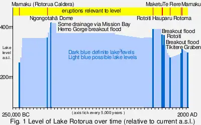The lake as shown in Figure 1, has had periods at multiple different lake levels since the caldera's Mamaku ignimbrite eruption, related to both volcanic activity and subsidence within the Taupō Rift.[3] The lake all time high occurred sometime after the formation of the Ngongotahā Dome which records this on its flanks, and is now dated at 200,000 years.[4]:149,171 Previously this dome's eruption was assigned much closer to the time of the Mamaku ignimbrite eruption, so the lake maximum high stand was assumed to be more directly related to the caldera's formation. Breakout floods are suspected through the Hemo Gorge after the lake's maximum high stand, definitely after the Rotoiti eruption of the Ōkataina Caldera, with formation of a channel within the western lake floor of Lake Rotoiti and suspected after the Hauparu eruption throught the Kaituna River Gorge.[3] Several other lakes of volcanic origin are located nearby to the east, around the base of the active volcano Mount Tarawera and these also over time have varied in size or existence due to volcanic action.
