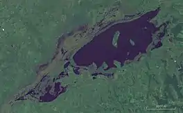 Lake Wamala covers an area of approximately 250 square kilometres (97 sq mi).[3] It is dotted by many islands, including Lwanju Island, Mabo Island, and Bagwe Island, Kiraza, Kazinga, among others. Several rivers flow into the lake, including the River Nyanzi, the River Kitenga, the River Kaabasuma, the River Mpamujugu, and the River Bbimbye. The lake is drained by the Kibimba River into the Katonga River, which in turn drains into Lake Victoria. The Kibimba River, however, is highly seasonal and for much of the time its course remains essentially dry. Lake Wamala is of significant economic and cultural interest locally and is jointly administered by the districts of Mubende, Mityana, and Mpigi, each of which share a part of the lake along common borders.[2]