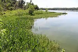 The lake is in the Ocala Uplift District, situated between the forested highlands of the Fairfield Hills area and the surrounding dissolution valleys of the Alachua Prairies. Lake Wauburg is irregular in shape, covering 1.6 square kilometres (0.62 sq mi) with about 5 kilometres (3.1 mi) of shoreline. The fertile green water supports shad and a deep grass line is good to hold fish. It had a maximum depth of 3 metres (9.8 ft) and offers excellent Black Crappie and Bass fishing. The lake is adjoined to the east by Sawgrass Pond. A marshy area to the northwest is separated from the lake by a topographic high. The north end of the Lake is owned by the University of Florida and is operated as a recreation facility for students and faculty. The southern edge is boarded by Paynes Prairie Preserve State Park, which allows public access to the lake and a boat launch. Outboard motors are prohibited on the lake but trolling motors and paddle boats are permitted.