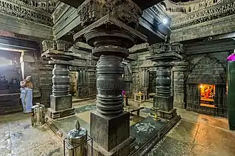 The interior of the temple consists of a closed hall (mantapa) of modest size with four polished lathe turned pillars supporting the roof.[12] The four central pillars divide the hall into nine equal "bays" (compartments) and nine decorated ceilings.[13] The sanctum of the three shrines contain the images of Venugopala, Narayana in the middle and Lakshminarasimha; all forms (Avatar) of Vishnu.[8]