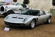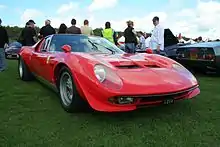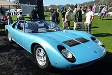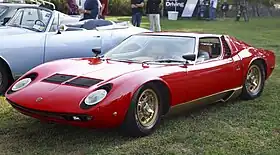 The Lamborghini Miura is a sports car produced by Italian automaker Lamborghini between 1966 and 1973. The car was the first supercar with a rear mid-engined two-seat layout, although the concept was first seen in a production road car with René Bonnet's Matra Djet, introduced in 1964.[4] This layout has since become the standard for high-performance sports and supercars.[5] When released, it was the fastest production road car.[6]