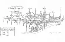 On 24 December 1881, Palatine Ludwig Railway Company (Pfälzische Ludwigsbahn-Gesellschaft) established a yard for loading timber near the station in order to improve operations.[51] This later developed into Lambrecht freight yard, since Lambrecht station had reached the limits of its capacities and, for reasons of topography, an extension of the track layout was impossible.[52] Frankeneck freight yard was also built at the other end of the track that developed into the Little Cuckoo Railway.[53] In order to get to the freight yard, the trains had to reverse in Frankeneck station, with the locomotive running around the train. The freight yard itself had four main tracks.[54]