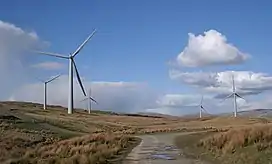 Some 100 metres west of the summit, on the eastern side of the bridleway, the ruins of a small building may be seen. The exact nature of this structure is unclear, but local residents state that it was used as a shelter for members of shooting parties on the fell. It is possible to continue in a southerly direction along the bridleway and complete the walk by joining the A684, Sedbergh Road. There is a large wind farm owned by Innogy just to the east of the summit. The wind farm, which can generate 6.5 Megawatts of electricity, was opened in September 2000 and at that time it was the largest wind farm to be built in England since 1993.[2] The land on which the wind farm is built is out of bounds to unauthorized personnel.