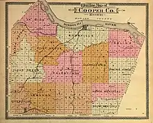 1897 Civil Townships of Cooper County Missouri. Note LaMine Township in the northwest of the map. From p. 7 of "Illustrated Historical Atlas of Cooper County, Missouri" (State Historical Society of Missouri)