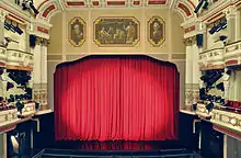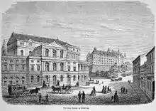 In the middle of the 19th century, the Altenburg venues no longer met the demands of the public: in 1868, Duke Ernst I advocated the construction of a theatre in Altenburg. Thus, from 1869 to 1871, the "New Ducal Court Theatre"[6] by architect Otto Brückwald, a pupil of Gottfried Semper, was built in the style of the Neo-Renaissance with three tiers (matroneum, balcony) and prosceniums and Mittellogen as well as a round ceiling mantle, whose allegorical paintings were created by the painter Höffemeyer from Munich.[7] Including decoration and machinery, the construction costs amounted to approximately 350,000 marks.[8] On 16 April 1871 the inauguration took place with Der Freischütz by Carl Maria von Weber under the direction of Wilhelm Stade, who was the musical director until 1874. The first season began on 24 September 1871 with Heinrich Laube's Die Karlsschüler[9] In addition to Bellini, Donizetti, Mozart, Lortzing, Schiller, Kotzebue and Scribe, the repertoire also included plays by Birch-Pfeiffer. Stade left rehearsals to the 2nd Kapellmeister Georg Riemenschneider, under whose directinon the celebrated Altenburg premiere of Richard Wagner's Tannhäuser took place in 1873. In 1875, under the musical direction of Kapellmeister H. Heynke[10] Wagner's Lohengrin and in 1876 Der fliegende Holländer. In 1886, Altenburg saw the first performances of Bizet's Carmen and Wagner's Meistersinger.