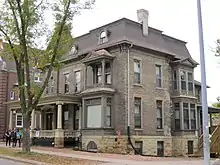The John Bradley Winslow house at 131 Langdon St was built in 1893 as a 2.5-story generally cube-shaped Queen Anne-style house, with brick walls and hip roof. John B. Winslow was an attorney and judge who was appointed to the state Supreme Court in 1891, shortly before he built this house, and became Chief Justice in 1907. The house is a good example of how buildings are sometimes updated to fit current styles. Its original Queen Anne look can be seen in a photo from 1896-1900 in the walking tour guide.[2] Some time after, the 2-story portico with the columns and the door frame with the broken pediment were added to remake it as a more stylish Colonial Revival.[11][3]