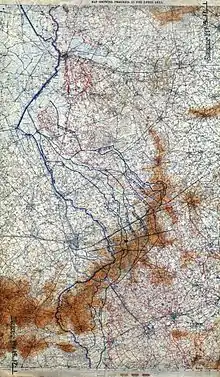 On 17 August, French heavy howitzers battered Les Lilas and Mondovi blockhouses all day and by nightfall both strong points had been breached and the garrisons captured. The bag of prisoners taken since 16 August was more than 400, along with fifteen guns. From the southern edge of the inundations between Dixmude and Drie Grachten, the French line had been pushed forward to the west bank of the Steenbeek as far as the south end of St Janshoek. South of Mondovi blockhouse, the Steenbeek had been crossed and on the extreme right, the 1re Armée had swung northwards to the south bank of the Broombeek, eliminating the possibility of the Fifth Army being outflanked from the north. French engineers had worked in the swamps and morasses to repair roads, bridge streams and build wire entanglements, despite constant German artillery fire.[53] The advance brought the French clear of the northern stretch of the Wilhelmstellung (third position).[30]