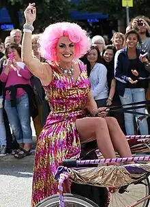 Babsan's character is of a happy, outspoken middle aged woman who uses glitter and glamour to make her days less boring.[11] Part of the joke is that Babsan's husband, a taxi driver called Gunnar which the audience never gets to meet, is a very ordinary and boring man. Babsan made her TV debut as a recurring figure in the 1992 show Babbla med Babsan.[12] The show also aired on TV3 during 1994 and 1996, giving her a total of three seasons and eight episodes. Babsan also appeared as a guest in the SVT teen comedy series En klass för sig in 2000.[13] She is also a hostess at the gay-nights at the nightclub "Lady Patricia" in Stockholm.[14]