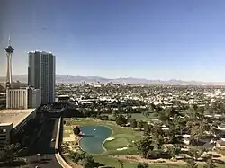 The view of the green from Westgate Las Vegas with The Strat Hotel & Casino & Tower in the background.