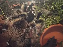 When threatened, the tarantula will raise its legs in the air, as well as the front of its body, in order to deter predators. If the attacker continues to attack, the tarantula will bite. The Brazilian salmon pink tarantula is capable of delivering a painful bite. They are known to bite only when provoked, and even then, this is a last resort. Bites from L. parahybana are mechanically dangerous but not medically significance since fangs, which can be up to an inch long, are capable of penetrating human skin but the venom is weak to humans. Some sites claim that a bite from a salmon pink is similar to that of a cat.[4] However, rather than biting, they choose to flick urticating hairs from a patch on their abdomen; these hairs are covered in barbs which irritate the skin and put off potential predators. These hairs are extremely irritating; in the hobby, they are considered to be one of the more painful hair types.