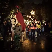 Contemporary Laternelaufen is usually organized (privately) by parents or (publicly) by kindergartens and schools, parishes or even political parties.[2] The ways often lead through forests (if any available in the neighbourhood) since there the streets are not continuously lit so that the lanterns are the only sources of light. The procession is accompanied by parents, group leaders etc., for official pageants the organizers often also hire somebody to play St. Martin, who is displayed as a bearded man in a medieval soldier's uniform wearing a long red cape or cloak, often riding on a horse in front of the children.