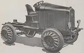 The gearbox is a 3-speed manual unit with a transfer case[12] giving 6 forward speeds and 2 reverses.[6][10][12] The differential system can lock the drive on any axle through a lever next to the driver's seat.[13] The tractor has a four-wheel steering system. The wheels could be mounted with retractable spuds for improving grip on some surfaces.[12]