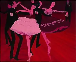 The painting shows the "lissom dancers in their richly decorated dresses and high-heeled shoes".[2] It also includes a self-portrait of the artist in the top-left corner, "more vulnerable than the rest, dancing alone without a partner."[1]