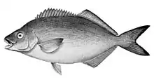 - ↑ Christopher Scharpf & Kenneth J. Lazara, eds. (25 February 2021). "Order Centrarchiformes: Families Centrarchidae, Elassomatidae, Eoplosidae, Sinipercidae, Aplodactylidae, Cheilodactylidae, Chironemidae, Cirrhitidae, Latridae, Percichthydiae, Dichistitidae, Girellidae, Kuhliidae, Kyphosidae, Oplegnathidae, Terapontidae, Microcanthidae, and Scorpididae". The ETYFish Project Fish Name Etymology Database. Christopher Scharpf and Kenneth J. Lazara. Retrieved 10 August 2021.