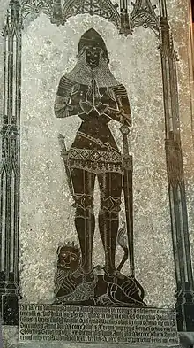 All Saints' church, Laughton, anachronistic re-used monumental brass made circa 1405, of a knight wearing the style of armour worn at the Battle of Agincourt (1415), with Gothic-style canopy, serving as ledger stone for the remains of William Dalison[7] (died 1546), who lived well into the Renaissance age when the taste for the Gothic style had long passed
