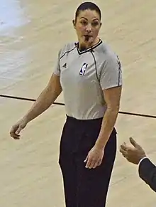 Lauren Holtkamp (born November 24, 1980) is a professional basketball referee in the National Basketball Association (NBA), wearing number 7. Holtkamp became the third woman to be a full-time NBA referee.[2] Holtkamp also played college basketball at Drury University from 2000 to 2004.[3] Holtkamp previously refereed the last five NBA Development League seasons before becoming a full-time referee for the 2014–15 NBA season. Holtkamp officiated four seasons in the WNBA including the WNBA 2014 conference finals. Holtkamp graduated from Emory University with a Master of Divinity.[4] She also graduated from Drury University with both a Master of Arts in Communication and a Bachelor of Arts in Business Administration.[5] In June 2017, Holtkamp married NBA referee Jonathan Sterling.[6][7] In 2019, Holtkamp gave birth to their daughter.[8]