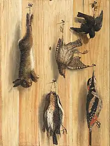 Trompe-l'œil still life of birds hanging from nails against a wooden wall