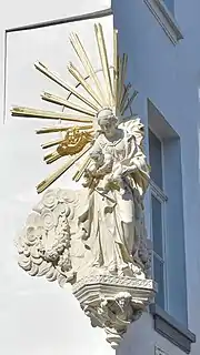 A work attributed to him on the basis of documents from the 18th century is the statute of the Virgin and Child, which is attached to the facade of a building located on the corner of the Lange Klarenstraat and the Meir in Antwerp. This statue was previously attributed to Pieter Verbrugghen the Elder (Antwerp 1615 – Antwerp 1686). The late Baroque statue initially consisted of a group of three figures including a figure of Saint Aloysius. It was originally made for the boarding school of the Jesuits on the Sint-Jacobsmarkt in Antwerp but after the abolition of the Jesuit order in 1773, the statue fell into private possession, although it remained in situ. It was moved in 1814, without the statue of Saint Aloysius, first to the corner of the Meir and Twaalfmaandenstraat, and then in 1872 to its current location. This statue shows the remarkable skill of Gillis as he created a very elegant statue in terms of posture, facial expression and the folds of the robe of the Virgin. Behind he Virgin a cloud cover with garlands and a large gilded halo is attached to the corner of the building. While the Virgin now appears to show the Christ Child to the passersby, she originally showed him to a kneeling Saint Aloysius, the patron saint of young students.[14] The statue was restored at the end of 2013. During the restoration an additional angel head was added to the gilded halo.[15]
