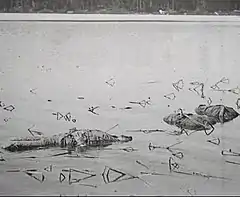 Outside, the sled used for the transport of goods and equipment was missing, and a fox pen behind the cabin that contained five valuable foxes owned by Logan was empty.[1] A blood-stained claw hammer was found in the corner of the pen.[5] The search team checked on the men's trapping lines, and discovered the frozen remains of twelve marten, four foxes, and one skunk, suggesting that their traps in the surrounding forest had been unattended to.[1]