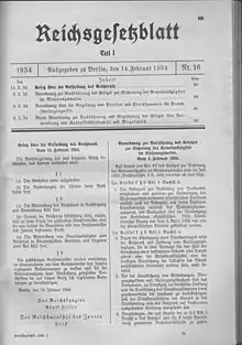 In accordance with the emergency powers granted to it by the Enabling Act (23 March 1933), the Reich government (i.e., the Reich Chancellor and his cabinet) enacted the law without passage through the Reichstag and without obtaining the signature of Reich President Paul von Hindenburg. On the face of it, the law appeared to be a clear violation of the Enabling Act's Article 2 that specifically safeguarded the existence of the Reichsrat: "Laws enacted by the Reich Cabinet may deviate from the constitution as long as they do not affect the institutions of the Reichstag and the Reichsrat."[4] However, the subsequent Law on the Reconstruction of the Reich (30 January 1934), passed by the Reichstag in the form of a constitutional amendment, contained the following language in Article 4: "The Reich government may issue new constitutional laws."[5] Thus, some have argued that the abolition of the Reichsrat by cabinet law may have adhered to the legal process then in place.[6] A further counterargument advanced by historian Richard J. Evans notes that many of the state governments had been overthrown by the Nazis via force or coercion, and therefore "were not properly constituted or represented" when the Reichsrat gave its assent to the above laws.[7] Needless to say, these constitutional points concerning the legitimacy of the law were never litigated by the Supreme Judicial Court in Nazi Germany.