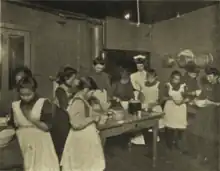 The settlement maintained a library; kindergarten; playground; gymnasium; classes in chair caning, bent iron work, knife work, carpentry, drawing, athletics, embroidery, knitting, crocheting, cooking, millinery, clay modeling, arts and crafts; clubs with various interests, dramatic, debating, parliamentary drill, citizenship, story telling; game and pool rooms; dances; entertainments, concerts and lectures; and mothers' club. Summer work included a roof and backyard playground.[3]