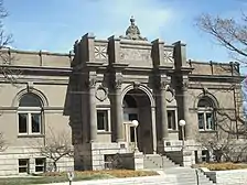 While the library was in a stage of renewed growth, its collection quickly outgrew its facilities. With 6,000 volumes there was not enough room to store all the books, and the $1 per year charge per resident was not ample enough to provide funding for a new building.[3] One resident, Peter Emery, was interested in library science and petitioned philanthropist Andrew Carnegie for funds dedicated to the erection of a new library. Carnegie agreed to the request and donated $27,500 on the stipulation the city of Lawrence transform it into a free public library and dedicate $2,750 each year to its upkeep and maintenance.[2][3] This deal was called to a vote in the town and was overwhelmingly accepted. The new building began construction and was dedicated during the week of the semi-centennial celebration of Lawrence.[5] The library officially opened to the public on December 26, 1904.[3]