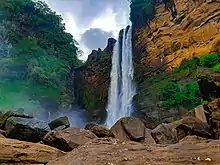 Laxapana Falls is 126 m (413 ft) high[1] and the 8th highest waterfall in Sri Lanka and 625th highest waterfall in the world.[2][3] It is situated in Maskeliya area in Nuwara Eliya District, about 16 km (9.9 mi) from Maskeliya town on Maskeliya-Norton Bridge road, in a village called Kiriwan Eliya. It is formed by Maskeliya Oya near the confluence of Kehelgamu Oya and Maskeliya Oya which forms Kelani River.[4] The falls gives its name to twin hydroelectric power stations, Old Laxapana Power Station which generates 50 MW of electricity and New Laxapana Power Station which generates 100 MW.