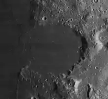 The interior of this formation is relatively flat and smooth, with no significant craterlets to mark the surface. The outer rim is battered, worn, and notched with past impacts. Only slight wrinkle ridges now mark where the western rim once lay.